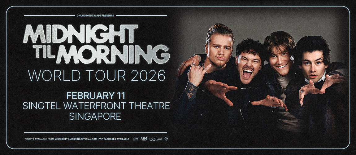 Promoted by AEG Presents Asia, Midnight Til Morning World Tour 2026 in Singapore, will take place at the Singtel Waterfront Theatre on Feb 11, 2026.Midnight Til Morning is comprised of four rising stars from the U.S. and Australia: Conor Smith (22, Central Coast, NSW), Mason Watts (25, Toowoomba, QLD), Shane Appell (22, Upstate New York), and Zach Newbould (22, Boston, MA). Since their formation, the group has seen explosive growth across TikTok, Instagram, and streaming platforms, with fans around the world rallying to their sound, story, and brotherhood. With “Bye,” they prove they’re not just a viral sensation — they’re artists.